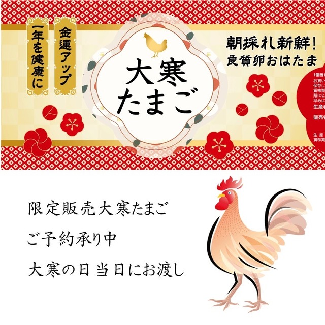 大寒たまごとは、古くから「健康に良い」と言われ、風水では「金運が上昇する」とされている縁起の良いたまごのことです。 大寒たまごは1年に1度の『大寒』の日に産まれるたまごです。大寒は、1年を24の季節に分けた『二十四節季』の1つで、大寒の他には『立春』『夏至』『秋分』『冬至』などが代表的な二十四節季として知られています。 2024年の大寒の日は1月20日(金)です。大寒は日本で一番寒く、最も気温が低下する季節とされています。それだけ寒さの厳しい季節ですから、昔、鶏はあまりたまごを産まず、産卵数はかぎられていました。 そんな大寒の日の寒さに負けずに産まれるたまごは、たいへん希少で栄養価が高く、「大寒たまごを食べると健康に良い」と言われています。 また、大寒たまごは特に黄身の色が濃いとされ、風水では黄色が「金運を呼ぶ」と言われることから、大寒たまごは金運上昇のご利益があると考えられています。 健康運と金運のアップを祈願して、縁起物の大寒たまごはいかがでしょうか。